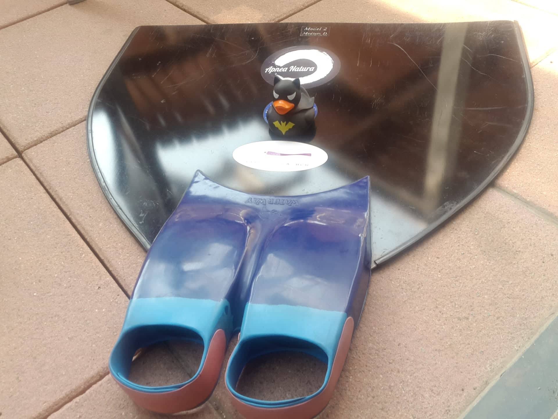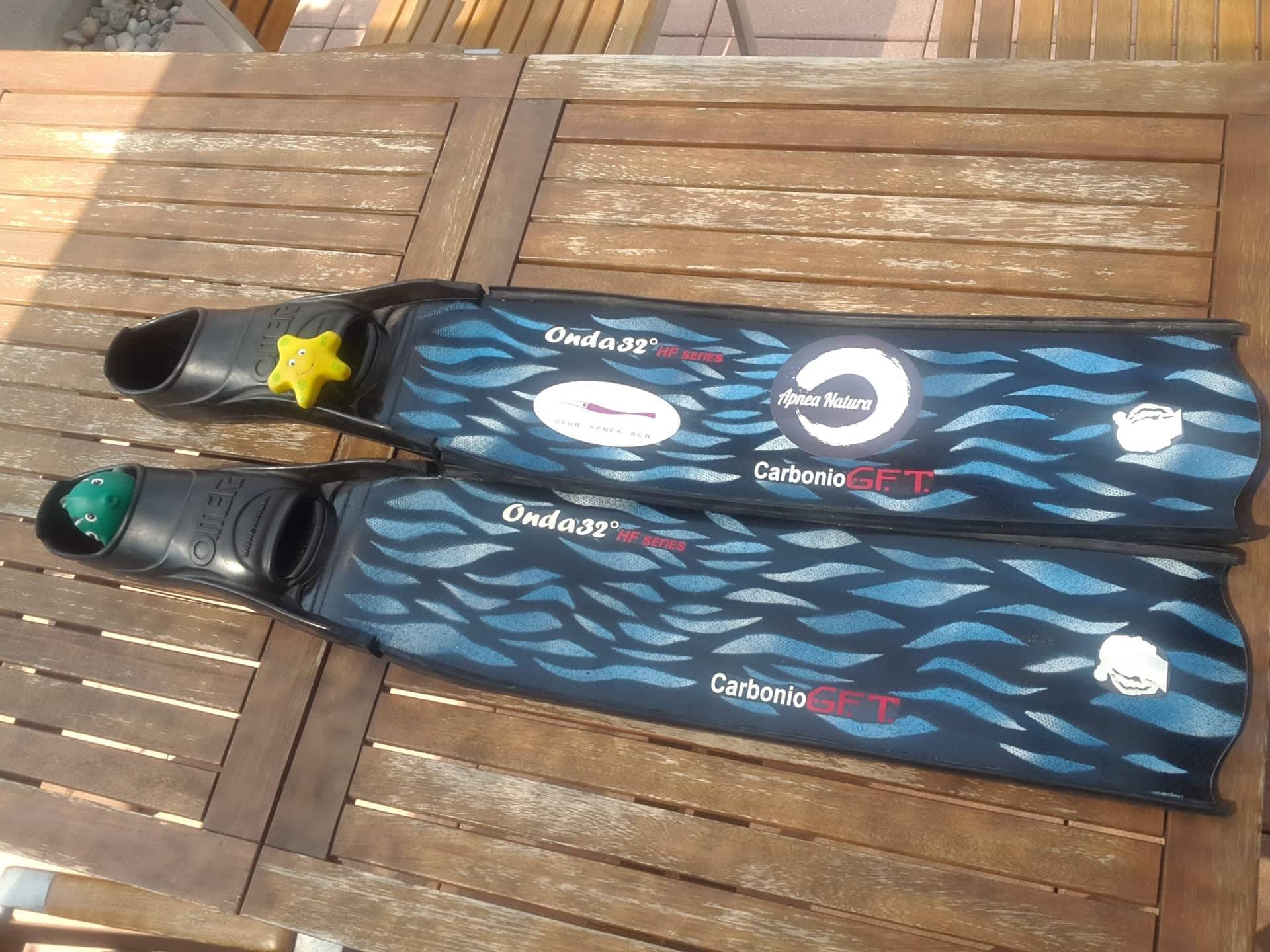 BIALETAS – En Freediving usamos aletas largas con calzantes. En general son más largas que las del buceo autónomo y las de piscina, para darnos mas velocidad. En los entrenamientos y técnica se pueden usar otras medidas como las rosas de la foto.